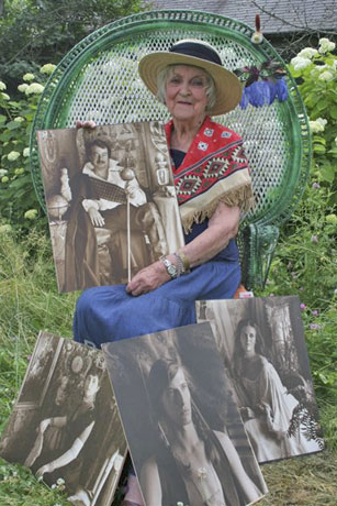 Lady Ostapeck sits for a portrait with a sampling of her portraits on the front lawn of her Fly Creek Valley home, where she’s lived and pursued her art since 1960.